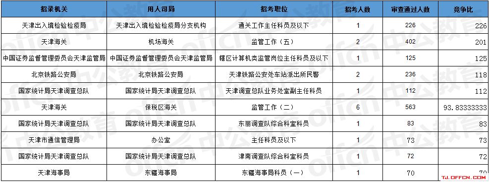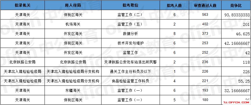 報(bào)名通過審核人數(shù)前十的職位主要集中在天津海關(guān)、北京鐵路公安局、天津出入境檢驗(yàn)檢疫局等部門,具體信息如下: