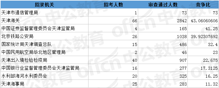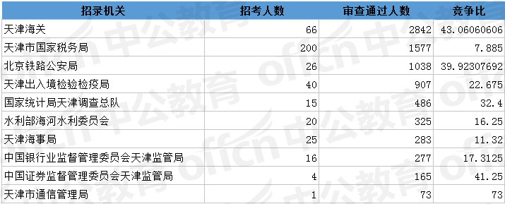 為幫助廣大考生更清晰的了解今日?qǐng)?bào)名情況,中公網(wǎng)校整理了審核通過(guò)人數(shù)前十位的部門(mén)以及競(jìng)爭(zhēng)比例最激烈的十大部門(mén),供廣大考生參考: