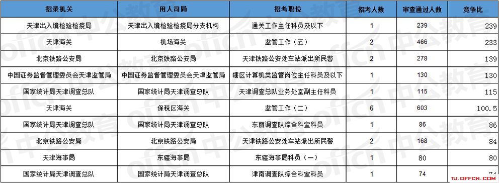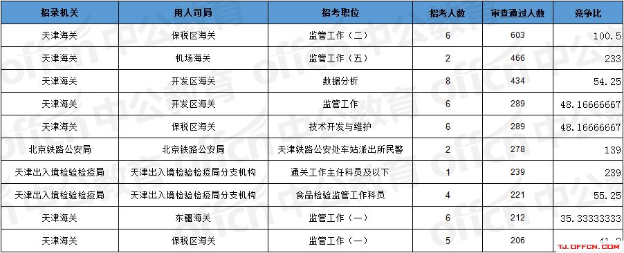 報名通過審核人數(shù)前十的職位主要集中在天津海關(guān)、北京鐵路公安局、天津出入境檢驗檢疫局等部門,具體信息如下: