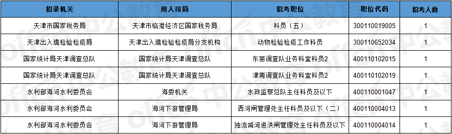 截止到5日16時,工作地點在天津的職位共有7個無人報考,占全部職位的3.3%。下圖是無人報考職位一覽表,中公網校專家建議廣大考生多關注一些較冷職位,避免激烈競爭,結合自身條件,找到屬于自己的職位。