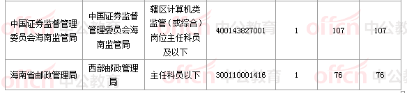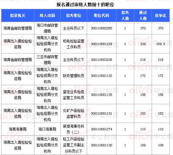 報(bào)名通過審核人數(shù)前十的職位主要集中在海南省郵政管理局、海南出入境檢驗(yàn)檢疫局、海南海事局等部門,具體信息如下: