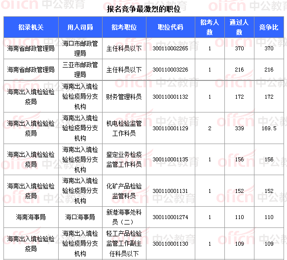 截止到5日16時(shí),競(jìng)爭(zhēng)比例的職位為海南省郵政管理局??谑朽]政管理局主任科員以下一職,招錄1人,截止到5日16時(shí)通過人數(shù)為370人。