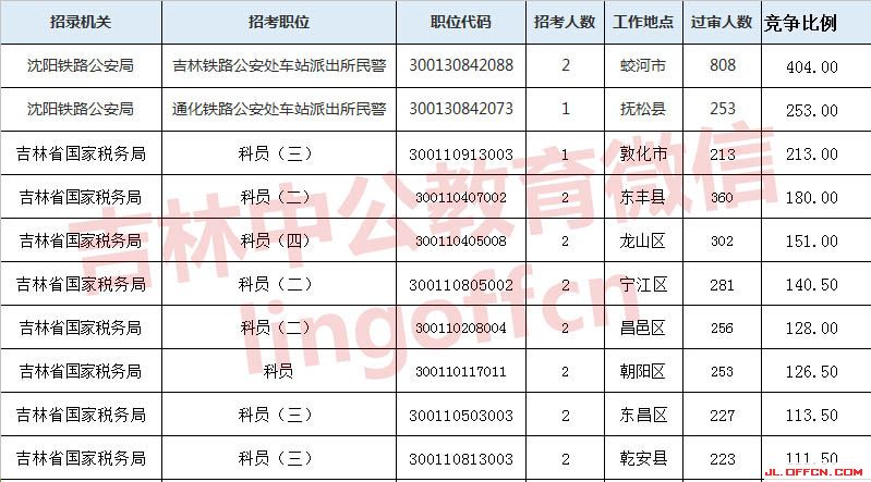 報名通過審核人數(shù)前十的職位主要集中在沈陽鐵路公安局、吉林國家稅務(wù)局等部門,具體信息如下: