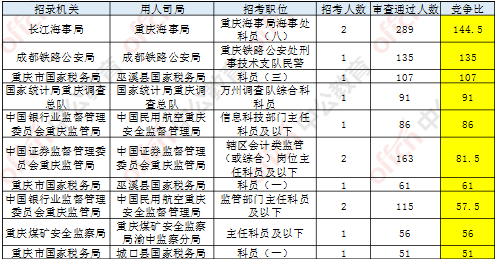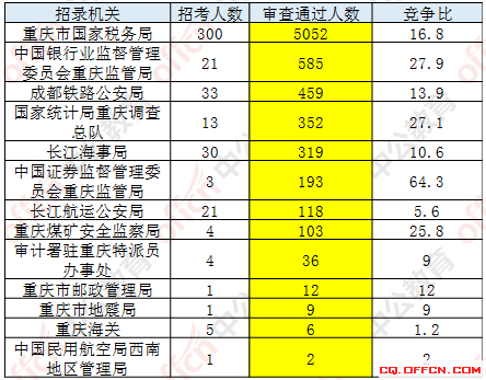 通過審核人數(shù)重慶市國家稅務(wù)局占鰲頭,同時重慶市國家稅務(wù)局在本次國考重慶地區(qū)招錄中,招錄崗位及人數(shù)亦是最多。而通過審核人數(shù)第二的中國銀行業(yè)監(jiān)督管理委員會重慶監(jiān)管局,招錄人數(shù)在13個部門中位居第五,僅招錄13個職位,21個人。