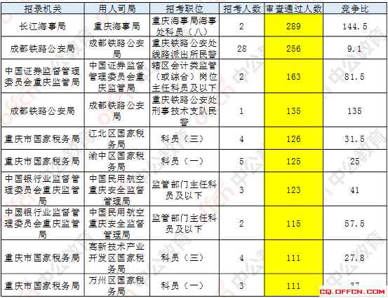 報名通過審核人數(shù)前十的職位主要集中在長江海事局、重慶市國家稅務(wù)局、中國證券監(jiān)督管理委員會重慶監(jiān)管局等部門,報名通過審核人數(shù)最多的職位亦是競爭比例的職位。報名通過人數(shù)位居第二的中國證券監(jiān)督管理委員會重慶監(jiān)管局的職位主要是從事從事轄區(qū)會計類監(jiān)管或內(nèi)部綜合管理等工作,為特殊專業(yè)職位(證監(jiān)法律類)職位,共兩個職位,且皆不限政治面貌、基層工作最低年限、服務(wù)基層項目工作經(jīng)歷。而重慶市國家稅務(wù)局的職位最熱崗位的政治面貌、基層工作最低年限、服務(wù)基層項目工作經(jīng)歷皆不限。主要招錄2016年及以后年度畢業(yè)的高校畢業(yè)生,女性,在本單位最低服務(wù)年限為5年的考生。