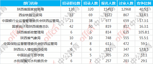 報(bào)名人數(shù)前十的職位主要集中在陜西省國(guó)家稅務(wù)局、中國(guó)保險(xiǎn)監(jiān)督管理委員會(huì)陜西監(jiān)管局、陜西省氣象局等部門,具體信息如下: