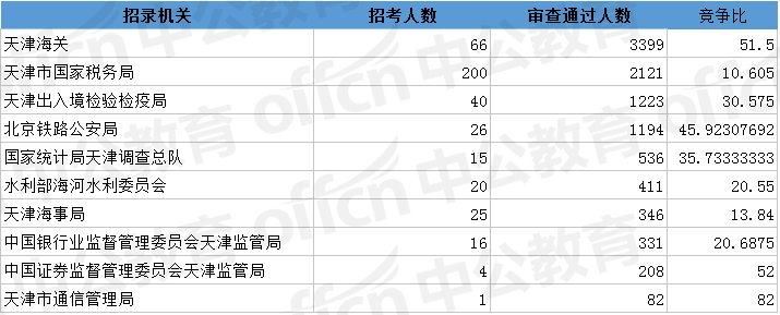 為幫助廣大考生更清晰的了解今日報名情況,中公網(wǎng)校整理了審核通過人數(shù)前十位的部門以及競爭比例最激烈的十大部門,供廣大考生參考: