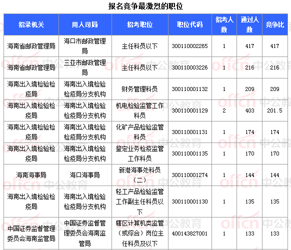 截止到6日16時(shí),競(jìng)爭(zhēng)比例的職位為海南省郵政管理局??谑朽]政管理局主任科員以下一職,招錄1人,截止到6日16時(shí)通過人數(shù)為417人。