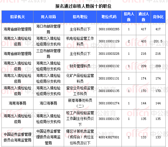 報(bào)名通過審核人數(shù)前十的職位主要集中在海南省郵政管理局、海南出入境檢驗(yàn)檢疫局、海南海事局等部門,具體信息如下: