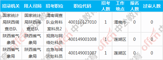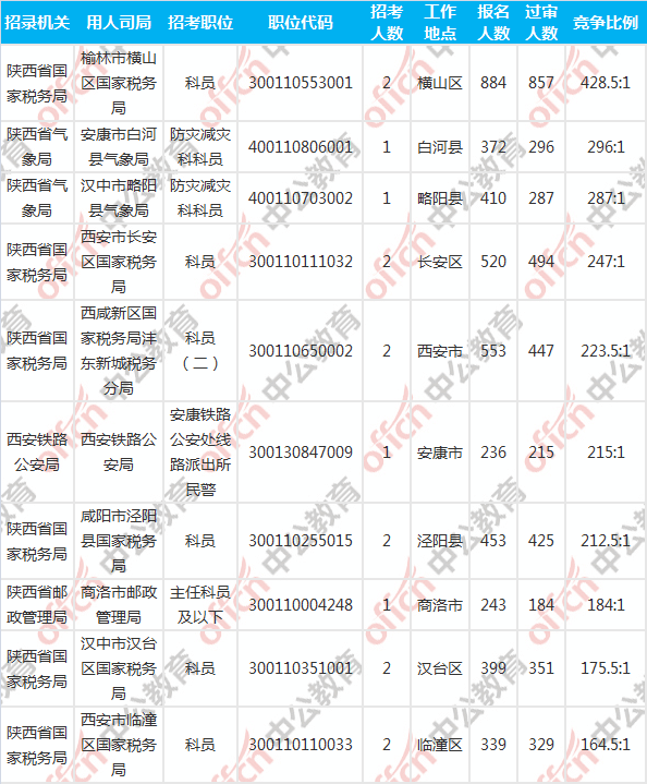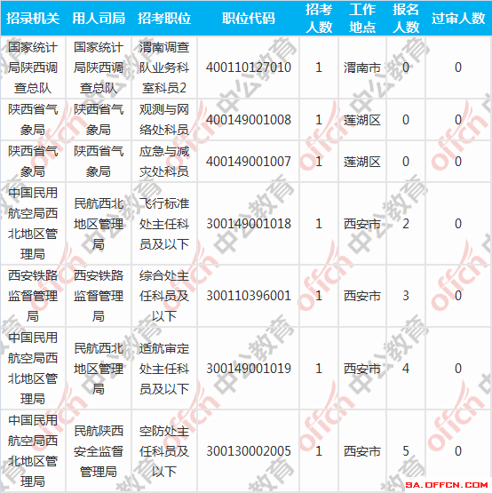 截至到6日16時(shí),工作地點(diǎn)在陜西的,過審人數(shù)為0的職位共有7個(gè)。下面是過審人數(shù)為0 的報(bào)考職位一覽表,中公網(wǎng)校專家建議廣大考生再仔細(xì)看看職位表,千萬不要錯(cuò)過了報(bào)名的時(shí)期。建議最晚不要超過6號(hào)報(bào)名,因?yàn)樵瓌t上資格審查是在報(bào)名后48小時(shí)內(nèi)進(jìn)行,尤其是報(bào)名人數(shù)較多的職位,招考單位審核可能不會(huì)很及時(shí),如果在8日18點(diǎn)之后才發(fā)現(xiàn)未通過資格審查,那就意味著你失去了這次參與國(guó)考的資格。