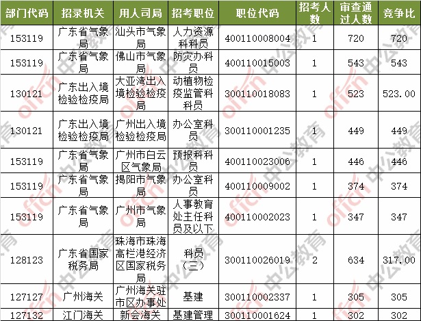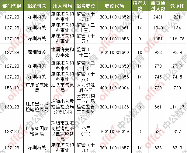 報(bào)名通過(guò)審核人數(shù)前十的職位主要集中在深圳海關(guān)、廣東省氣象局、珠海出入境檢驗(yàn)檢疫局等部門(mén),具體信息如下: