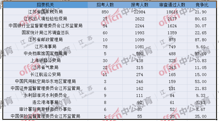 截止到6日16時,通過審核人數(shù)前三位的部門依次是:江蘇省國家稅務(wù)局、江蘇出入境檢驗(yàn)檢疫局、中國銀行業(yè)監(jiān)督管理委員會江蘇監(jiān)管局,三部門通過審核總?cè)藬?shù)達(dá)22417人,占通過審核總?cè)藬?shù)的82.6%。