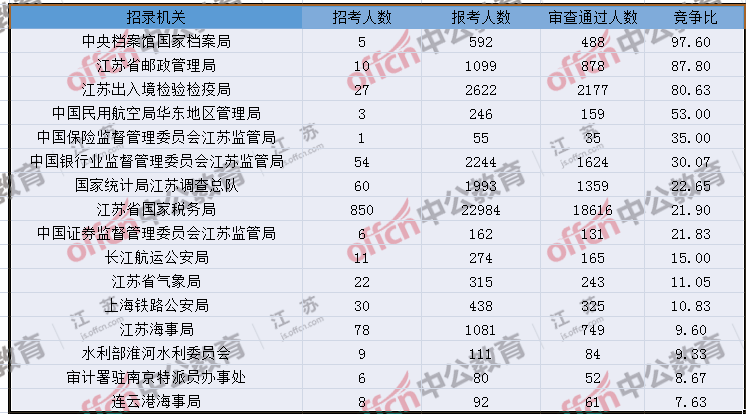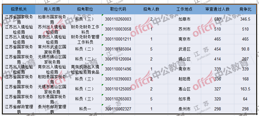 報名通過審核人數(shù)前十的職位主要集中在江蘇出入境檢驗(yàn)檢疫局、江蘇省郵政管理局、江蘇省國家稅務(wù)局等部門,具體信息如下:
