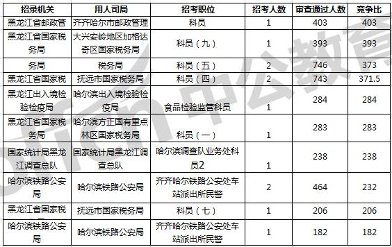 報(bào)名通過(guò)審核人數(shù)前十的職位主要集中在黑龍江省國(guó)家稅務(wù)局、哈爾濱鐵路公安局、黑龍江省郵政管理局等部門(mén),具體信息如下:
