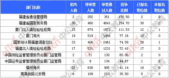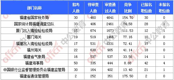 截止到6日16時(shí),通過審核人數(shù)前三位的部門依次是:福建省國家稅務(wù)局、國家統(tǒng)計(jì)局福建調(diào)查總隊(duì)、廈門出入境檢驗(yàn)檢疫局,三部門通過審核總?cè)藬?shù)達(dá)8775人,占通過審核總?cè)藬?shù)的59.39%。