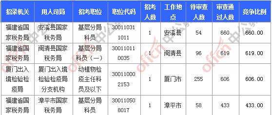 報(bào)名通過審核人數(shù)前十的職位主要集中在福建省國家稅務(wù)局、廈門出入境檢驗(yàn)檢疫局、廈門海關(guān),具體信息如下: