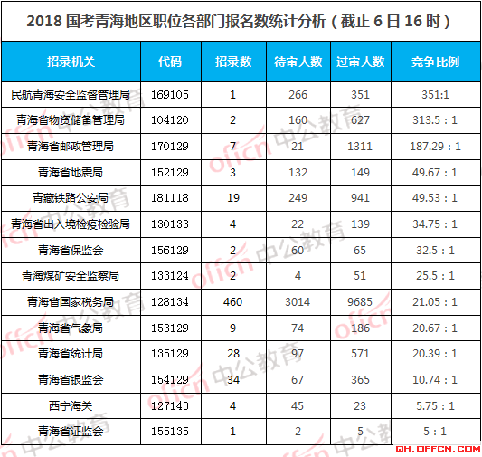 以下是6日16時(shí)各部門報(bào)名人數(shù)統(tǒng)計(jì)分析,其中中國(guó)民航青海安全監(jiān)督管理局、青海省物資儲(chǔ)備管理局、青海省郵政管理局等三個(gè)部門競(jìng)爭(zhēng)最激烈,競(jìng)爭(zhēng)比均已超過(guò)187:1。