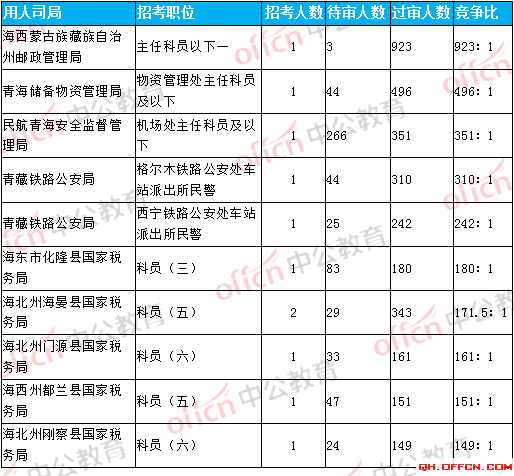 報(bào)名人數(shù)前十的職位主要集中在青海省郵政管理局、青海儲(chǔ)備物資管理局、青藏鐵路公安局、青海省國(guó)家稅務(wù)局等部門,具體信息如下: