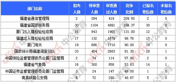 截止到7日9時,通過審核人數(shù)前三位的部門依次是:福建省國家稅務(wù)局、國家統(tǒng)計局福建調(diào)查總隊、廈門出入境檢驗檢疫局,三部門通過審核總?cè)藬?shù)達9639人,占通過審核總?cè)藬?shù)的56.29%。