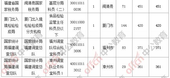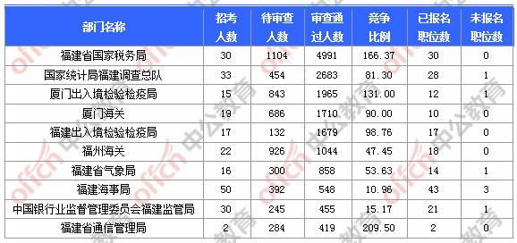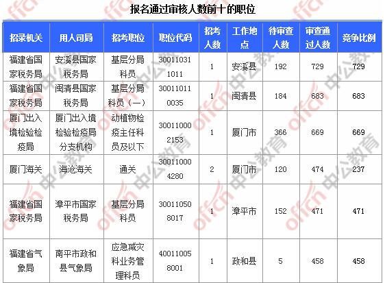 報名通過審核人數(shù)前十的職位主要集中在福建省國家稅務(wù)局、廈門出入境檢驗檢疫局、廈門海關(guān),具體信息如下: