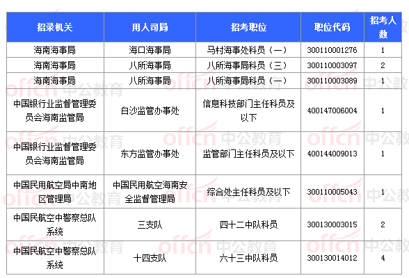 截止到7日16時(shí),工作地點(diǎn)在海南的職位共有8個(gè)無人報(bào)考,占全部職位的4.88%。下面是無人報(bào)考職位一覽表,中公網(wǎng)校專家建議廣大考生多關(guān)注一些較冷職位,避免激烈競(jìng)爭(zhēng),結(jié)合自身?xiàng)l件,找到屬于自己的職位。