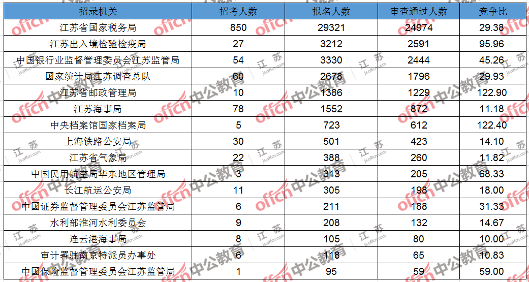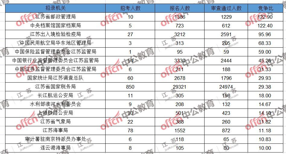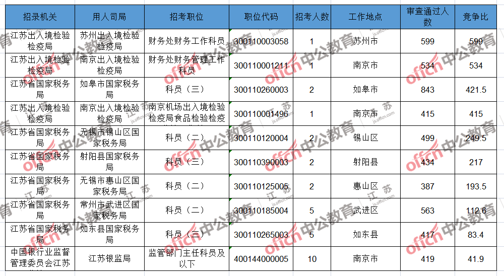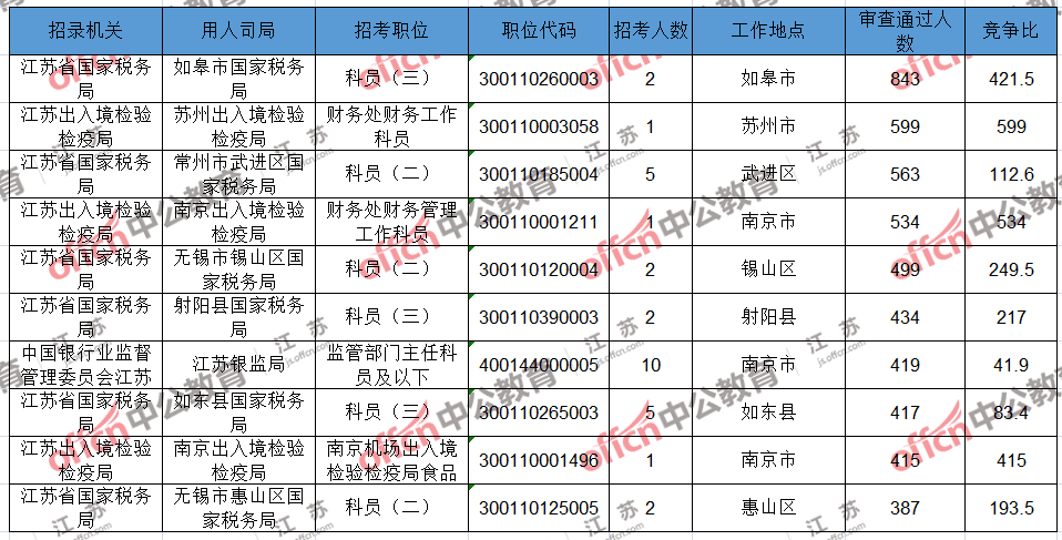 報(bào)名通過審核人數(shù)前十的職位主要集中在江蘇出入境檢驗(yàn)檢疫局、江蘇省郵政管理局、江蘇省國(guó)家稅務(wù)局等部門,具體信息如下: