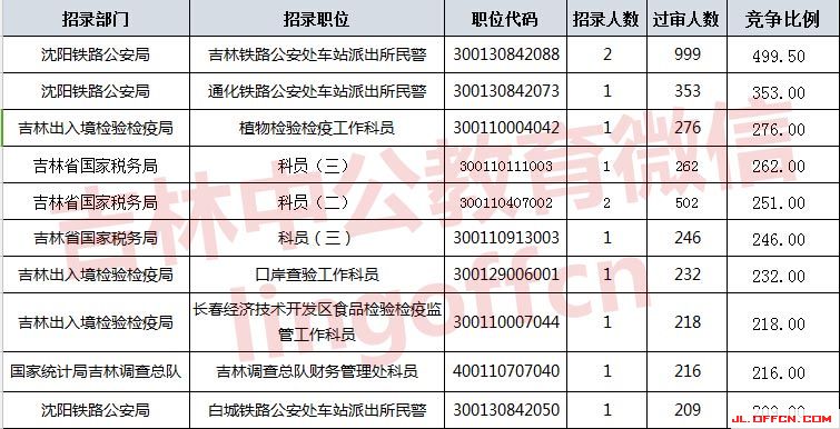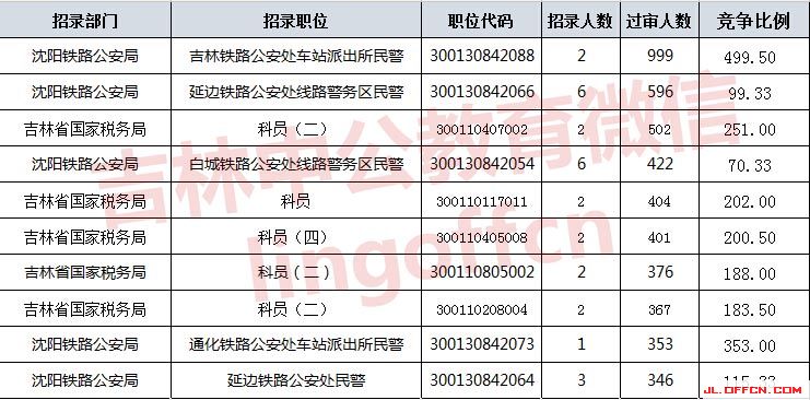 報(bào)名通過(guò)審核人數(shù)前十的職位主要集中在沈陽(yáng)鐵路公安局、吉林國(guó)家稅務(wù)局等部門,具體信息如下: