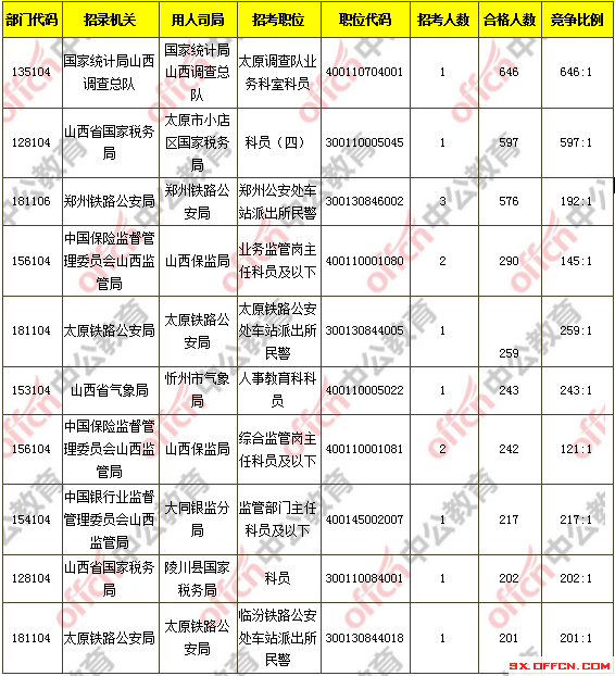 報名通過審核人數(shù)前十的職位主要集中在國家統(tǒng)計局山西調(diào)查總隊、山西省國家稅務(wù)局、鄭州鐵路公安局等部門,具體信息如下: