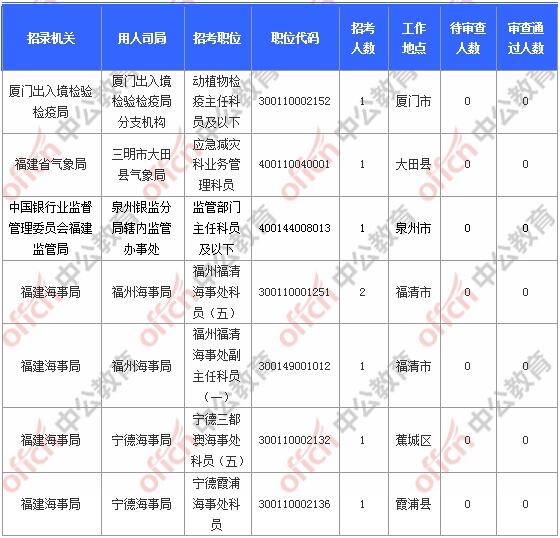 截止到7日16時(shí),工作地點(diǎn)在福建的職位共有7個(gè)無(wú)人報(bào)考,占全部職位的3.16%。下面是無(wú)人報(bào)考職位一覽表,中公網(wǎng)校專(zhuān)家建議廣大考生多關(guān)注一些較冷職位,避免激烈競(jìng)爭(zhēng),結(jié)合自身?xiàng)l件,找到屬于自己的職位。