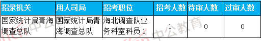 截至到7日16時(shí),工作地點(diǎn)在青海的職位只有1個(gè)無(wú)人報(bào)考,共招錄1人。用人司局是國(guó)家統(tǒng)計(jì)局青海調(diào)查總隊(duì),招錄1人,現(xiàn)還沒有人報(bào)名和通過審核。