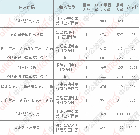 報名通過審核人數(shù)前十的職位主要集中在鄭州鐵路公安局、河南省氣象局、河南省國家稅務(wù)局,具體信息如下:
