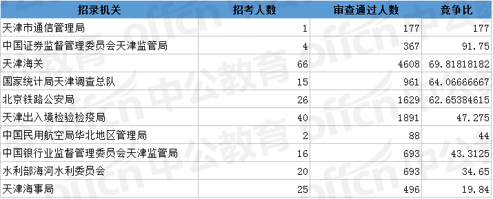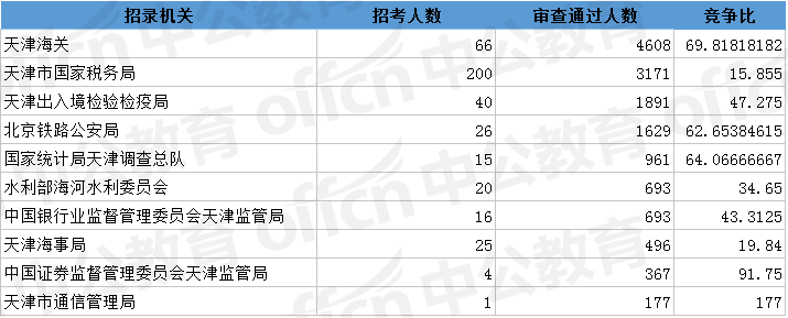 為幫助廣大考生更清晰的了解今日?qǐng)?bào)名情況,中公網(wǎng)校整理了審核通過人數(shù)前十位的部門以及競爭比例最激烈的十大部門,供廣大考生參考: