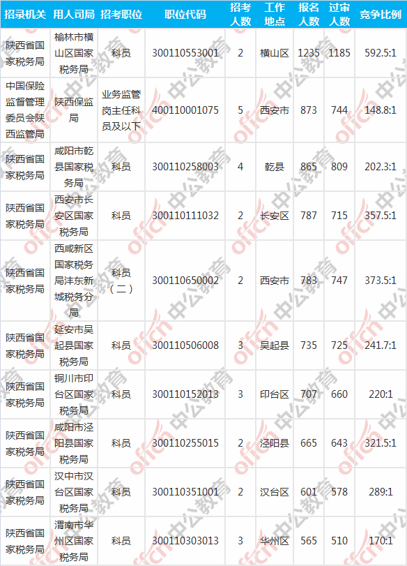報(bào)名人數(shù)前十的職位主要集中在陜西省國(guó)家稅務(wù)局、中國(guó)保險(xiǎn)監(jiān)督管理委員會(huì)陜西監(jiān)管局兩大部門(mén),具體信息如下: