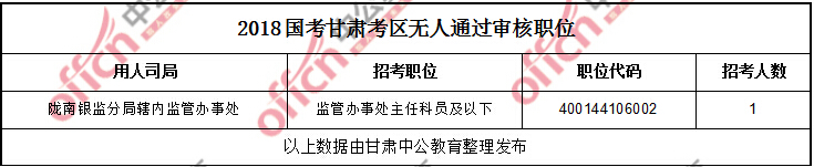 11月8日16時(shí),工作地點(diǎn)在甘肅的職位共有1個(gè)職位無人通過審核,占全部職位的0.5%,1個(gè)職位無人報(bào)考,占全部職位的0.5%。下面是無人待審及無人報(bào)報(bào)職位一覽表,中公網(wǎng)校專家建議廣大考生多關(guān)注一些較冷職位,避免激烈競(jìng)爭(zhēng),結(jié)合自身?xiàng)l件,找到屬于自己的職位。