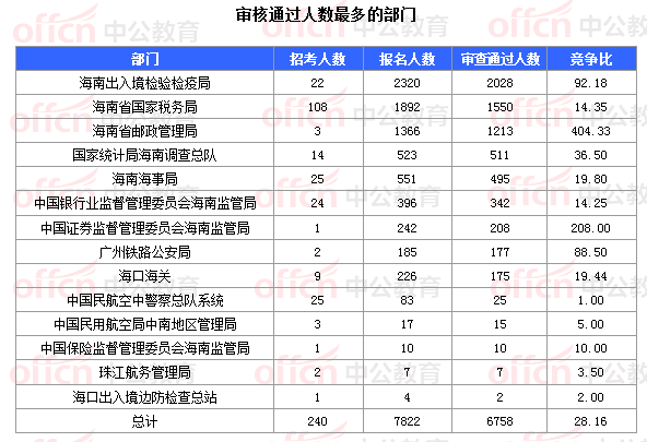 截止到8日16時,通過審核人數前三位的部門依次是:海南出入境檢驗檢疫局海南省國家稅務局、海南省郵政管理局、,三部門通過審核總人數達4791人,占通過審核總人數的70.09%。