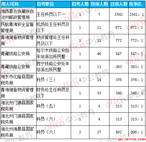 截至11月8日17:30,據(jù)青海中公網(wǎng)校統(tǒng)計(jì),國(guó)考職位中工作地點(diǎn)在青海省的職位報(bào)名人數(shù)為31914人,通過審核總?cè)藬?shù)為29933人,平均競(jìng)爭(zhēng)比例為52:1。