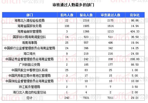 截止到8日17時(shí)30分,通過審核人數(shù)前三位的部門依次是:海南出入境檢驗(yàn)檢疫局海南省國(guó)家稅務(wù)局、海南省郵政管理局、,三部門通過審核總?cè)藬?shù)達(dá)5002人,占通過審核總?cè)藬?shù)的71.34%。