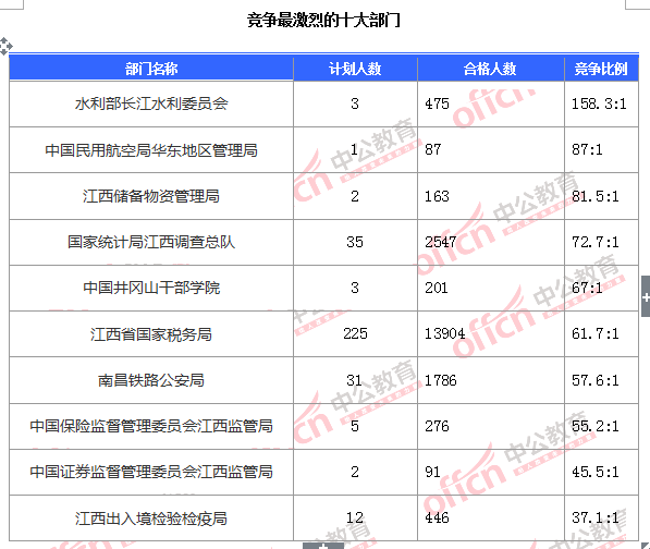 截至11月8日17:30時,據(jù)中公網(wǎng)校統(tǒng)計,國考職位中工作地點在江西的職位報名人數(shù)為25570人,通過審核總?cè)藬?shù)為21378人,平均競爭比例為69:1。