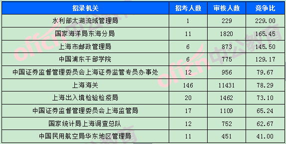 為幫助廣大考生更清晰的了解今日報名情況,上海中公網(wǎng)校整理了審核通過人數(shù)前十位的部門以及競爭比例最激烈的十大部門,供廣大考生參考: