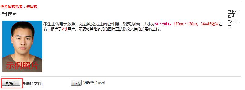 注:考生上傳電子版照片為近期免冠正面證件照,格式為jpg,大小為5K~50K,170px * 130px,34×45毫米左右,相當(dāng)于2寸照片。不要將其他格式的圖片直接修改文件的擴(kuò)展名上傳。