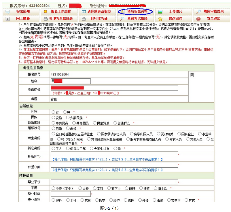 點(diǎn)擊圖3-1中‘報(bào)名資料填寫’按鈕會(huì)顯示如圖3-2頁面,考生填寫相應(yīng)的信息,帶有‘*’字樣的為必填項(xiàng),填寫完畢后點(diǎn)擊‘提交數(shù)據(jù)’即可。