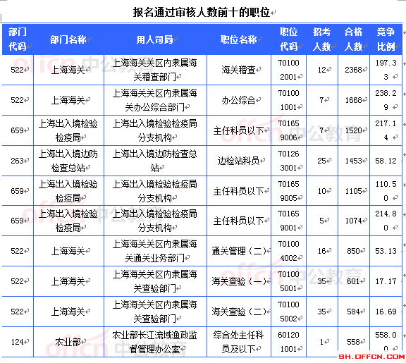 報名通過審核人數(shù)前十的職位主要集中在上海海關(guān)、上海出入境檢驗(yàn)檢疫局、上海出入境邊防檢查總站等部門,具體信息如下:
