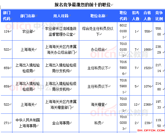 截至20日16時,招錄比例的職位為農(nóng)業(yè)部長江流域漁政監(jiān)督管理辦公室綜合處主任科員及以下一職,招錄1人,通過人數(shù)為558人,再創(chuàng)上海招錄比例新高!