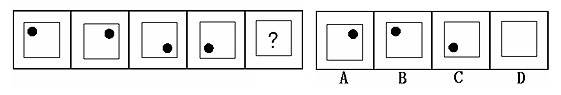 (答案:B。黑點在正方形中順時針移動。在第5個圖形中,應該正好移動到左上角。)