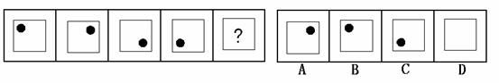 (答案:B。黑點在正方形中順時針移動。在第5個圖形中,應該正好移動到左上角。)