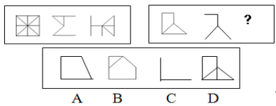 解答:正確答案為C。因為在第一套圖形中的后兩個圖形疊加在一起正好合成第一個圖形;在第二套圖形中的問號處如果為C項則與第一套圖形的規(guī)律一致。