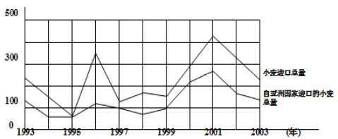 1.從1993年到1997年中,該國共從亞洲國家進口多少小麥(百萬噸)?