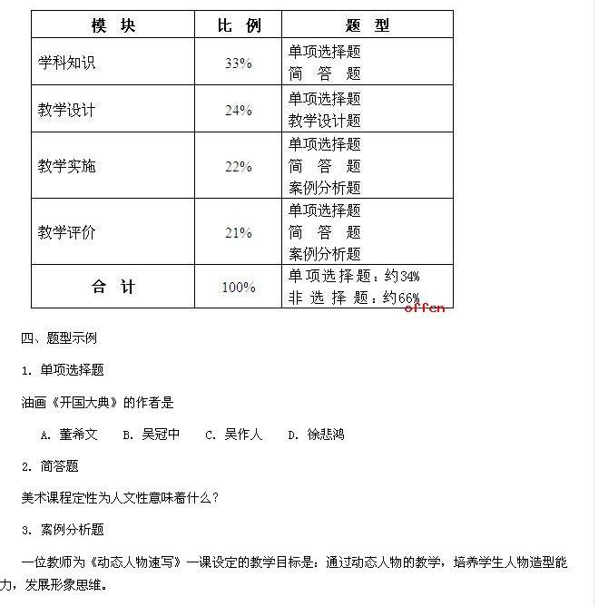 1.美術學科的知識與能力。掌握美術學科的基礎知識、美術創(chuàng)作和鑒賞的基本方法,在高中美術教學中有效地加以運用;掌握美術學科教學的理論和方法,了解高中美術課程的性質和基本理念,運用《普通高中美術課程標準(實驗)》指導教學。
