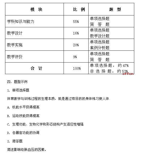 3.掌握體育的本質(zhì)與功能、目的與手段,熟悉體育過程要素與結(jié)構(gòu)、體育文化屬性與含義及 奧林匹克文化,了解中西方體育文化差異以及我國體育體制與體育發(fā)展趨勢(shì)等內(nèi)容。了解體育思想的形成與發(fā)展、體育目標(biāo)的結(jié)構(gòu)與功能;了解體育課程的 性質(zhì)與特點(diǎn)、編制與實(shí)施、資源開發(fā)與利用,掌握體育課程的學(xué)習(xí)、指導(dǎo)與評(píng)價(jià);熟悉課余體育活動(dòng)、訓(xùn)練與競賽的特點(diǎn)、組織與實(shí)施等內(nèi)容;掌握體育教學(xué)的 目標(biāo)、特點(diǎn)、原則、過程與方法等知識(shí),掌握體育教學(xué)計(jì)劃的制定、課堂教學(xué)的組織、管理與評(píng)價(jià)等內(nèi)容,了解我國常見的體育教學(xué)模式;熟悉《普通高中體育與健 康課程標(biāo)準(zhǔn)(實(shí)驗(yàn))》。了解運(yùn)動(dòng)訓(xùn)練的目的、任務(wù)、內(nèi)容及基本特點(diǎn),熟悉競技能力及其構(gòu)成因素,掌握運(yùn)動(dòng)訓(xùn)練的基本原則、訓(xùn)練方法與手段,掌握力量、速 度、耐力、柔韌和靈敏素質(zhì)的訓(xùn)練方法和手段,熟悉運(yùn)動(dòng)訓(xùn)練計(jì)劃的制定與組織實(shí)施等。