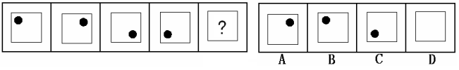 (答案:B。黑點(diǎn)在正方形中順時(shí)針移動(dòng)。在第5個(gè)圖形中,應(yīng)該正好移動(dòng)到左上角。)